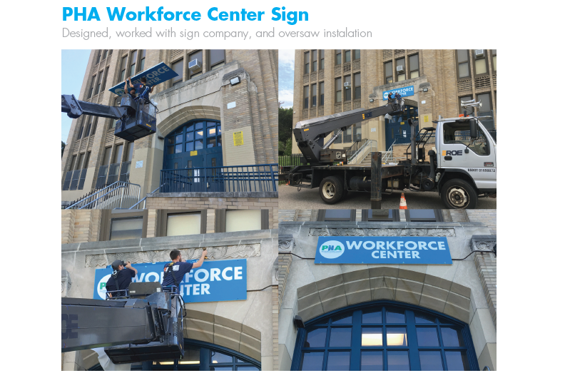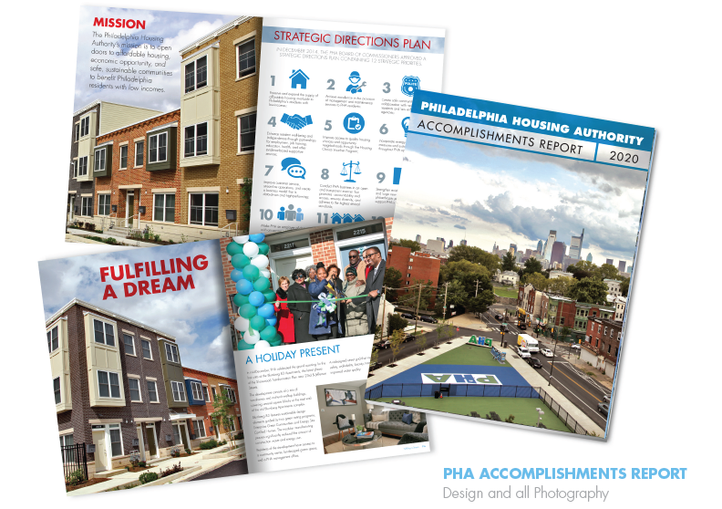 The sole designer in a five person Communications Department, serving 80,000 residents, and 1,400 employees. Working with the copywriter and CEO I create the annual report for both PHA and the non profit PhillySEEDS. I also create flyers for resident programs, job fairs, job training, trauma support or just a fun block party. I created pitch decks to help secure funding from potential investors. For ground breakings and grand openings I created invitations, event programs, stage signage, graphics and more.